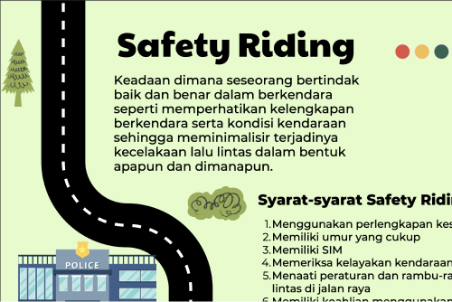 infografis safety riding menyajikan informasi tentang cara berkendara secara aman dan nyaman menggunakan motor yang dilengkapi dengan uraian tentang jenis-jenis rambu lalu lintas.