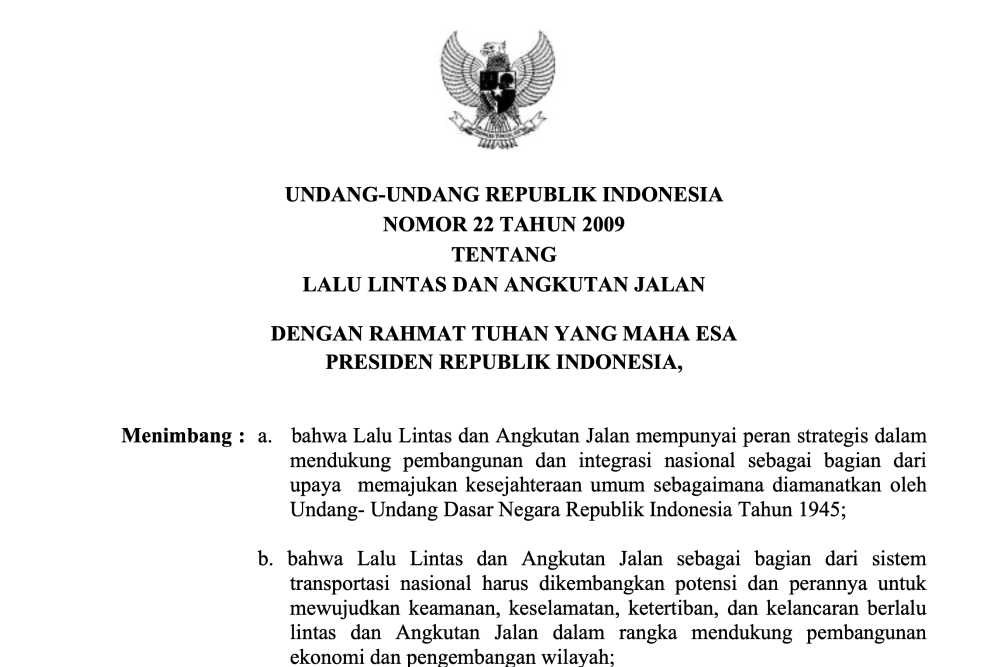 UU No. 22 Tahun 2009 tentang Lalu Lintas dan Angkutan Jalan.